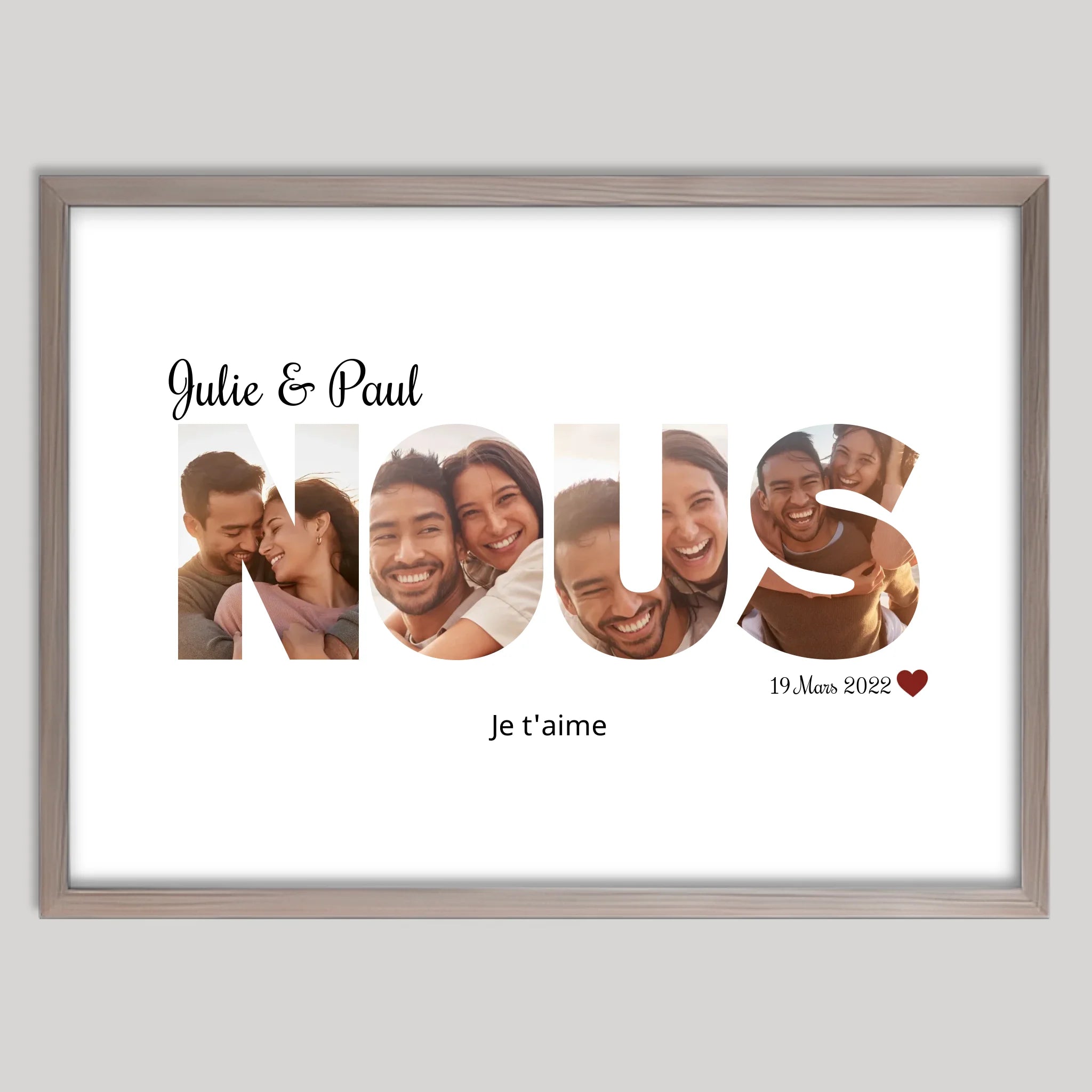 Pour les couples qui aiment jouer avec les mots et les images, l'Affiche lettres Love verticale offre une composition créative unique. Chaque lettre du mot "LOVE" est remplie de vos propres photos, créant ainsi un collage moderne et élégant qui célèbre votre histoire commune de façon originale.